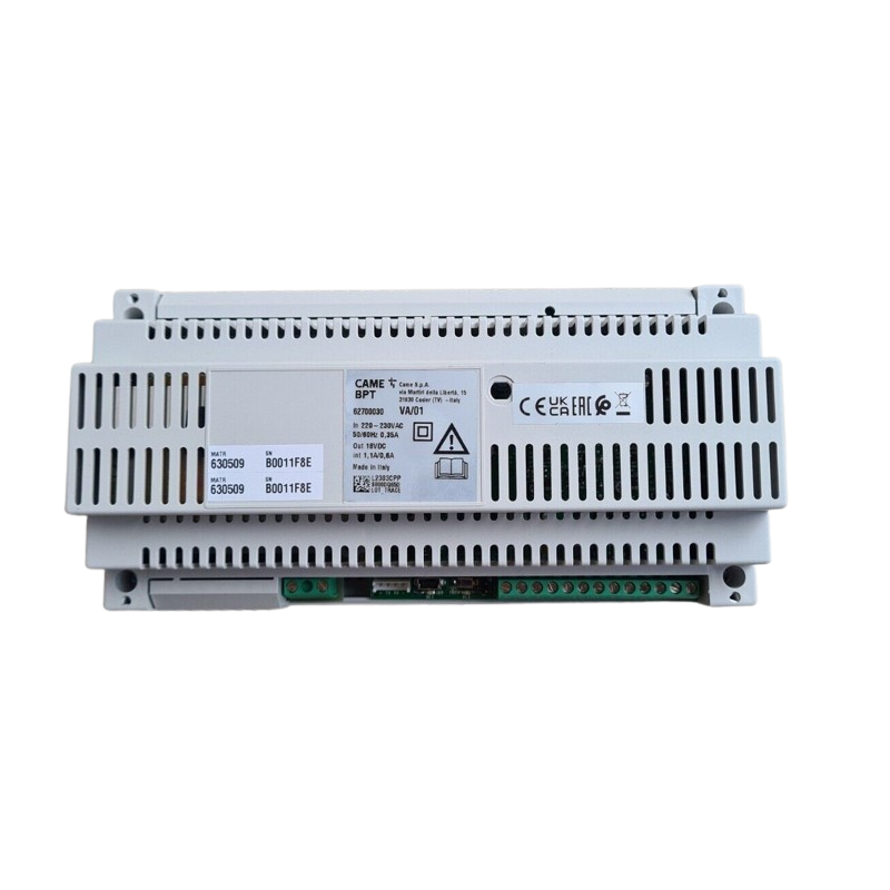 Le bloc d'alimentation VA/01 est conçu pour alimenter et contrôler les portiers vidéo BPT sur le système X1 à 2 fils, en garantissant des performances élevées, une protection électronique et une grande souplesse d'utilisation. Son architecture permet de gérer à la fois les panneaux de portier vidéo et la colonne montante du système, tout en prenant en charge la configuration d'accès multiples et de fonctions auxiliaires intelligentes.