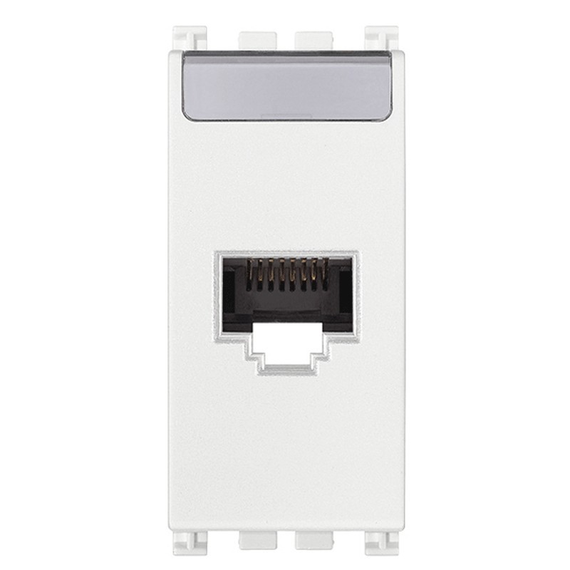 Prise de données Vimar Arke RJ45 avec connecteur Netsafe Cat. 5e, non blindé, câblage universel T568A/B, 8 contacts, bornes isolées sans outils, 1 module, couleur blanc.