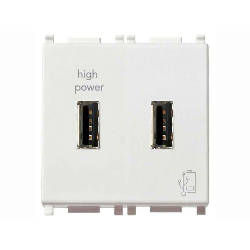 Chargeur USB double socket Vimar Plana Blanc. Le chargeur est alimenté et qui sert à charger tefonini,de smartphones,de tablettes et de tous les appareils qui peuvent être chargés via USB.