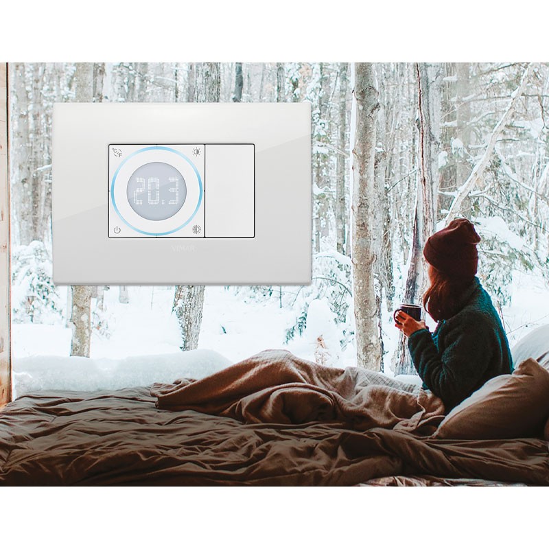 Thermostat rotatif Vimar 2 modules avec écran, blanc, pour montage encastré, à compléter avec les plaques Eikon, Arké, Plana. Alimentation électrique 100-240V.