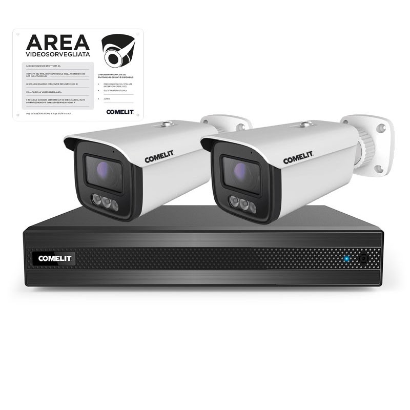 Kit de vidéosurveillance Comelit IP complet : NVR 8 canaux avec 1 TB, 2 caméras bullet 4MP AI, optique motorisée et panneau de zone vidéo surveillée. Gestion par l’application Comelit CCTV.