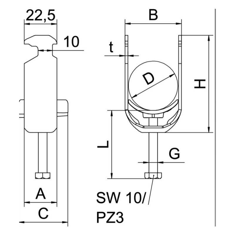 Staffa reggicavo con ancoraggio a testa di martello, coppa in plastica in polipropilene. Per il montaggio verticale e orizzontale di 1 cavo singolo su profilato a C. Per dimensioni scanalatura di 16-17 mm. Con coppa di pressione, testa a vite esagonale universale SW10, intaglio a croce e a taglio.