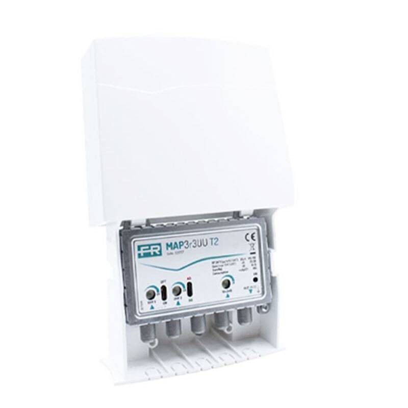 Amplificatore con 3 ingressi (III+DAB, UHF, UHF) da palo con guadagno 28dB e livello di uscita fino a 116dB?V in banda UHF (codice 223757)