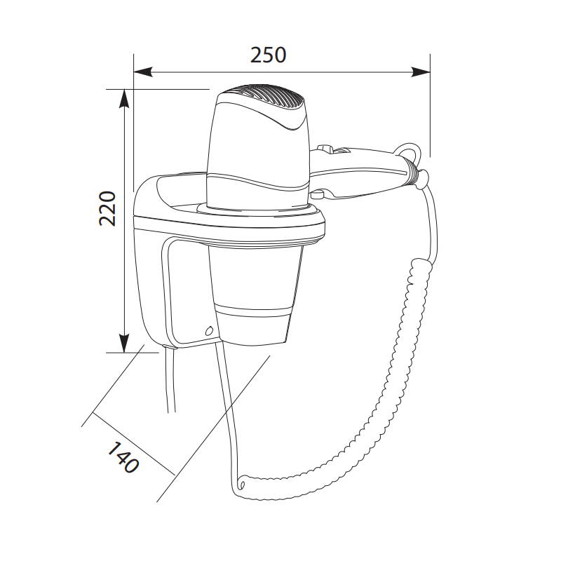 Estetica di fascia premium grazie ai particolari cromati sul phon e sulla base murale.