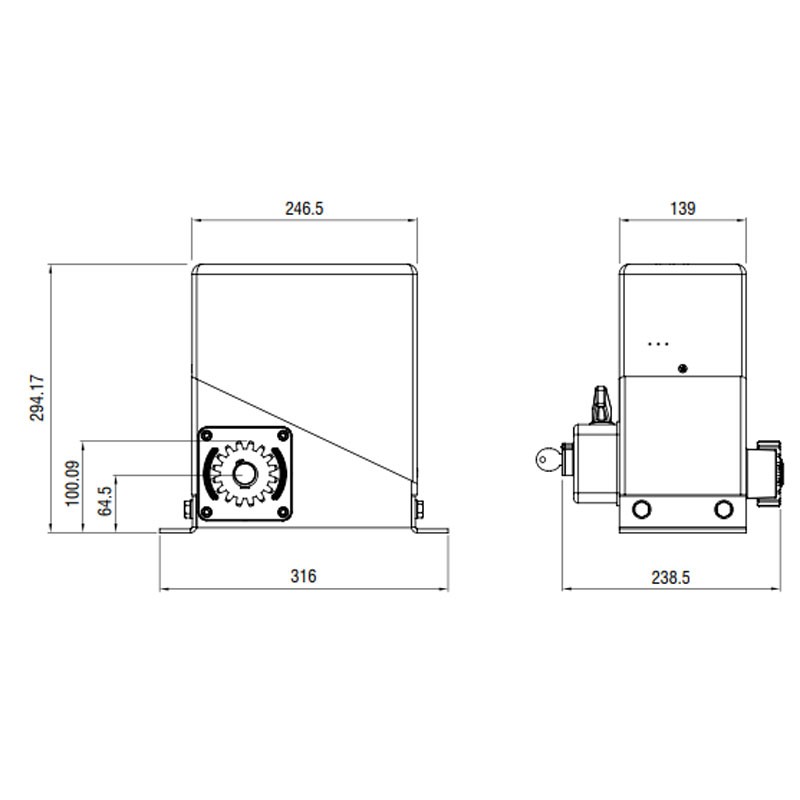 Cancello scorrevole Gibidi PASS 1841E, elettromeccanico irreversibile a 230 Vac, con apparecchiatura SC230E, rallentamenti, antischiacciamento, senza frizione meccanica, adatto per uso intensivo, peso anta fino a 1800 Kg.