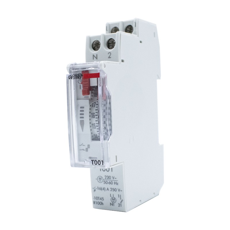 Interruttore Elettromeccanico Giornaliero Vemer T001 a Cavalieri, 1 modulo, per controllare un carico elettrico mediante un programma giornaliero.