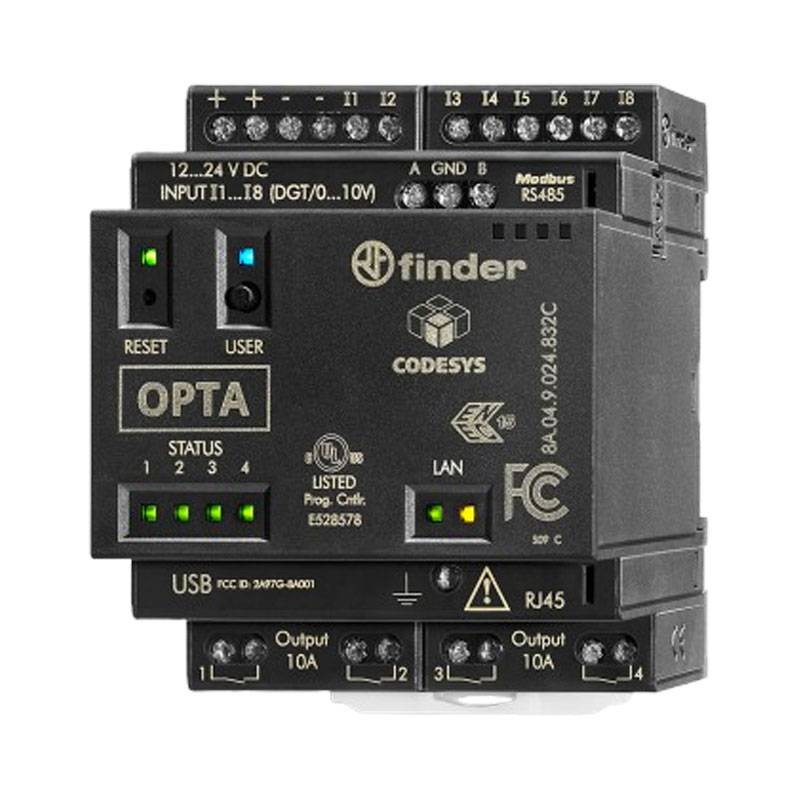 Relè logico Finder programmabile Opta, progettato per applicazioni industriali e di automazione, questo modulo è estremamente versatile e può essere programmato utilizzando linguaggi tradizionali come Ladder e FBD, o tramite un linguaggio open source innovativo come Arduino IDE. Il modulo è dotato di connettività avanzata, tra cui porta Modbus RS485, RJ45, USB (tipo C), e un modulo integrato WiFi/BLE, permettendo di collegarsi e comunicare facilmente con altri dispositivi e sistemi di controllo, con le seguenti caratteristiche:
