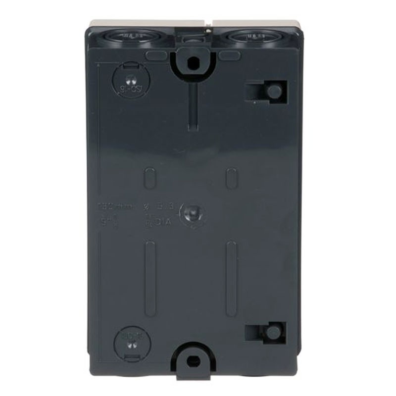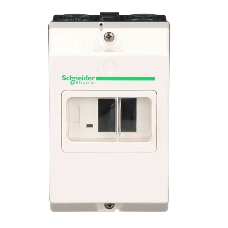 Involucro vuoto, per interruttori magnetotermici GV2ME. Involucro a montaggio superficiale con fissaggio a vite, 2 fori per pressacavi nella parte superiore e inferiore, copertura sigillabile. Involucro in policarbonato, doppio isolamento con conduttore di protezione, protezione IP55.