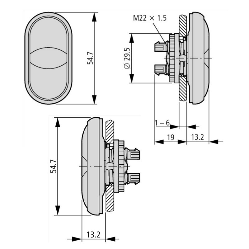 Pulsante doppio Eaton M22-DDL-GR, più indicatore luminoso verde/bianco/rosso, con le seguenti caratteristiche: