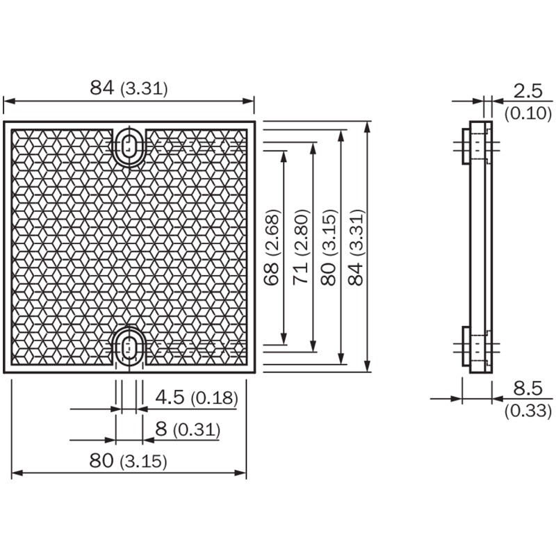 Riflettore Sick PL80A 80 mm x 80 mm quadrato avvitabile, 2 fori per il fissaggio, materiale PMMA/ABS, Temperatura ambiente di funzionamento 20 °C ... +65 °C.
