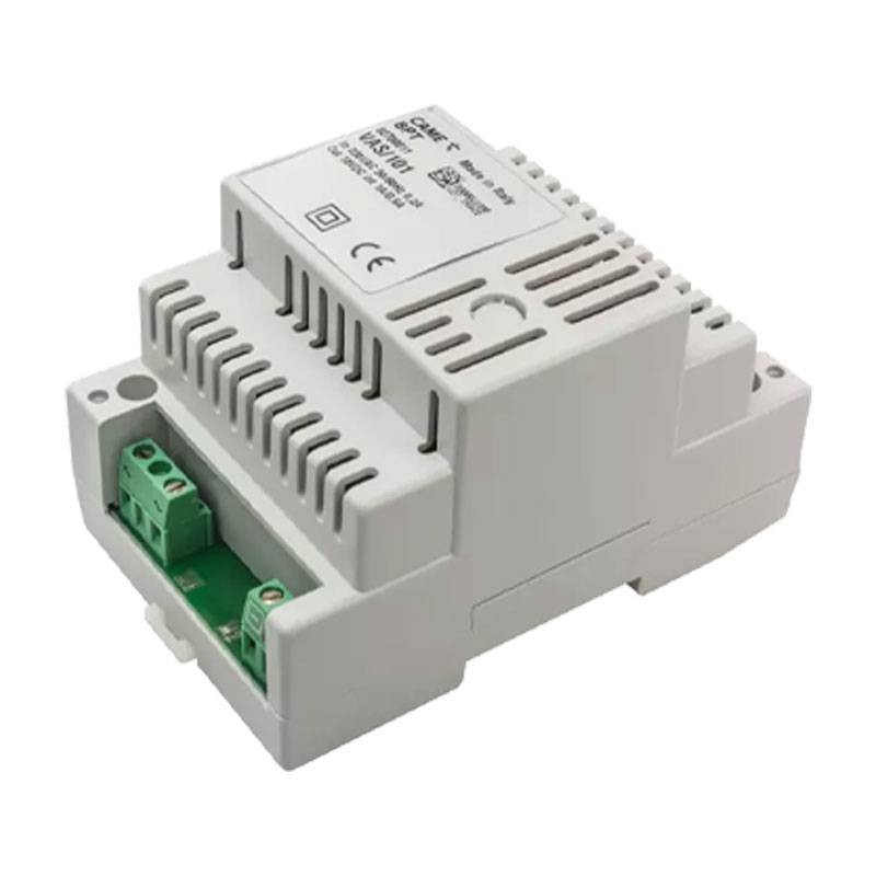 Il kit include l'alimentatore 62700011 in contenitore plastico per quadro elettrico, installabile su guida EN50022 in formato 4 moduli DIN basso. Fornisce 18 V DC 1000 mA max per posti esterni e derivati interni, con protezione elettronica contro sovraccarichi e cortocircuiti. Alimentazione da rete 230 V AC 50/60 Hz e grado di protezione IP30.