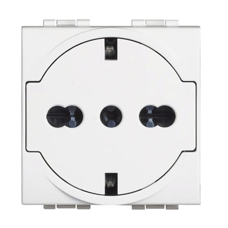 Presa elettrica schuko universale Bticino LivingLight colore bianco con protezione. La presa elettrica schuko detta anche presa tedesca permette di inserire al suo interno qualsiasi spina (piccola,grande e schuko).