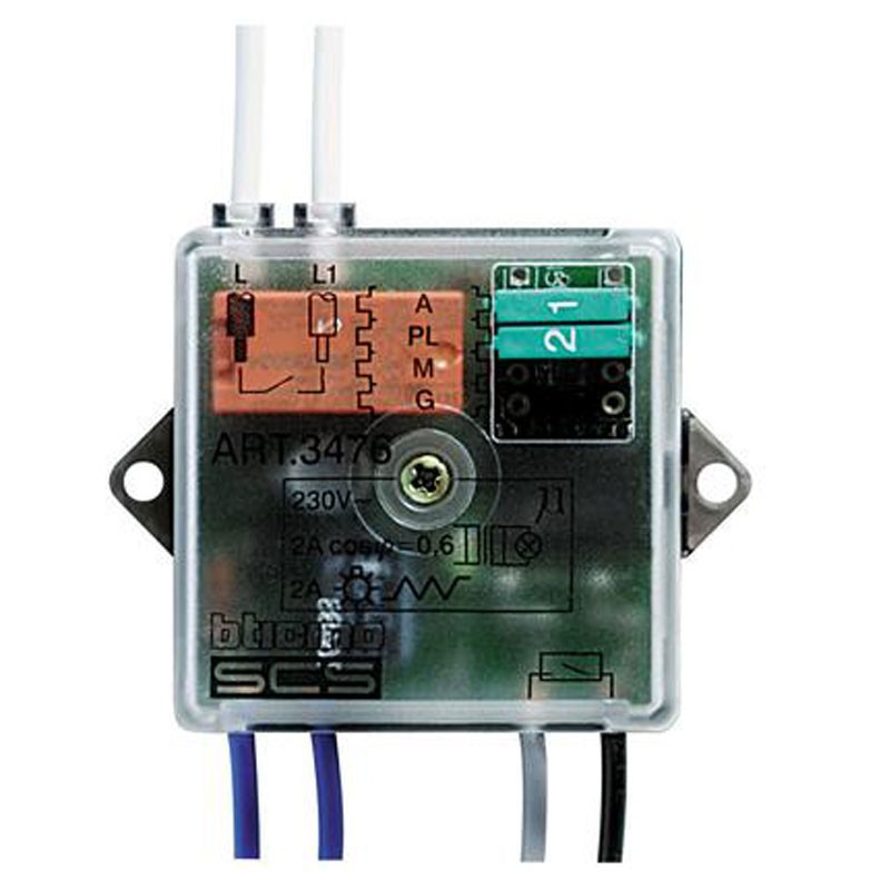 Attuatore Bticino con 1 relè per carichi singoli: 2A resistivi o lampade ad incandescenza, 2A induttivi per trasformatori ferromagnetici.