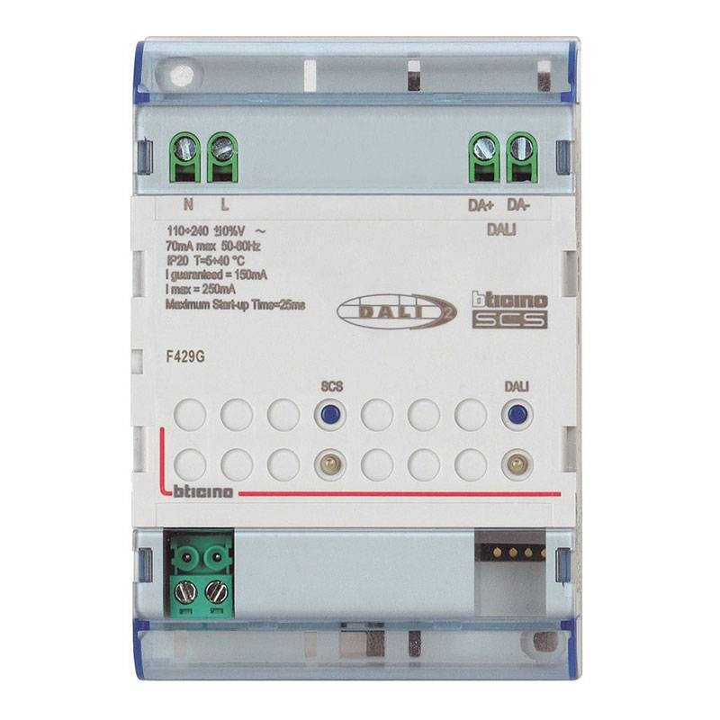 Il Bticino F429G è un gateway DALI / DALI-2 progettato per collegare il sistema domotico MyHome con impianti di illuminazione professionale pilotati tramite protocollo DALI-2. Dotato di 1 uscita indipendente, consente il controllo fino a 64 ballast o dispositivi DALI con supporto completo alle funzionalità ON/OFF, dimmerazione e gestione colore RGB/RGBW. È ideale per impianti con molte accensioni DALI.