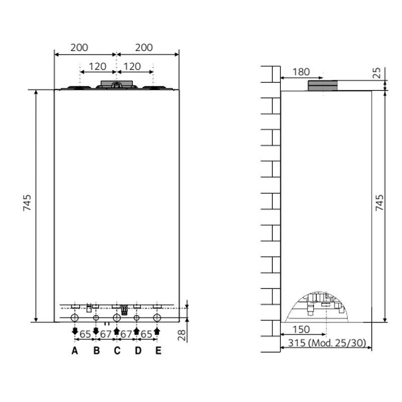 - Scarico coassiale Ø60/100: fino a 5 metri - Ø80/125: fino a 14 metri