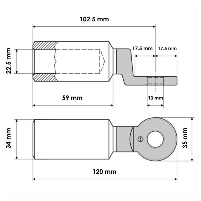 Il corpo del capocorda ha una geometria a intaglio profondo, che consente una compressione precisa e uniforme con utensili compatibili. L'ingresso facilitato del conduttore e l'assenza di foro spia migliorano l'efficienza dell'installazione, evitando dispersioni e deformazioni errate durante il serraggio.