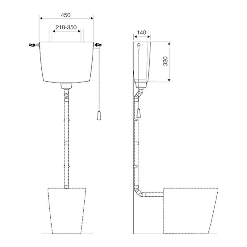 L’installazione in alta posizione con azionamento a catenella è semplice e veloce, grazie agli accessori per il fissaggio a parete inclusi. La cassetta è dotata di un morsetto WC Ø32 con catenella, mentre il tubo di cacciata e il coperchio superiore sono acquistabili separatamente, garantendo flessibilità nella configurazione.