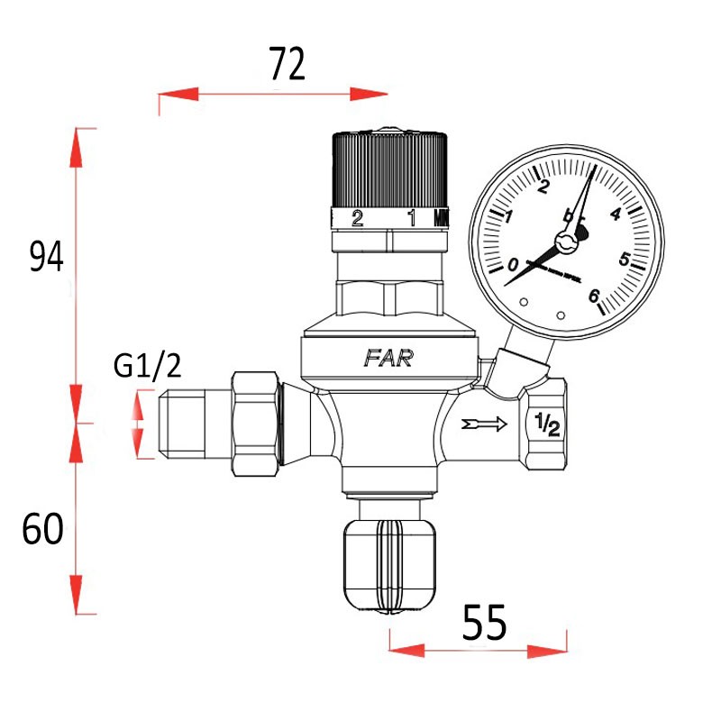 - Gruppo di riempimento automatico per impianti a circuito chiuso completo di manopola numerata, in ottone cromato, con attacco in entrata da 1/2 maschio (bocchettone), attacco in uscita da 1/2 femmina, attacco manometro da 1/4 femmina, filtro, valvola di ritegno, rubinetto d'arresto, vite di taratura. Temperatura max di esercizio 95°C. Temperatura min di esercizio 5°C. Pressione max a monte 10 bar. Pressione di taratura 0,5÷4 bar.