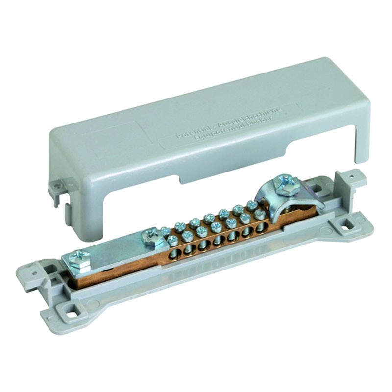 Barra di equipotenzialità Dehn con coperchio grigio, ideale per connessioni sicure di conduttori in impianti di messa a terra e protezione contro le scariche atmosferiche, con le seguenti caratteristiche: