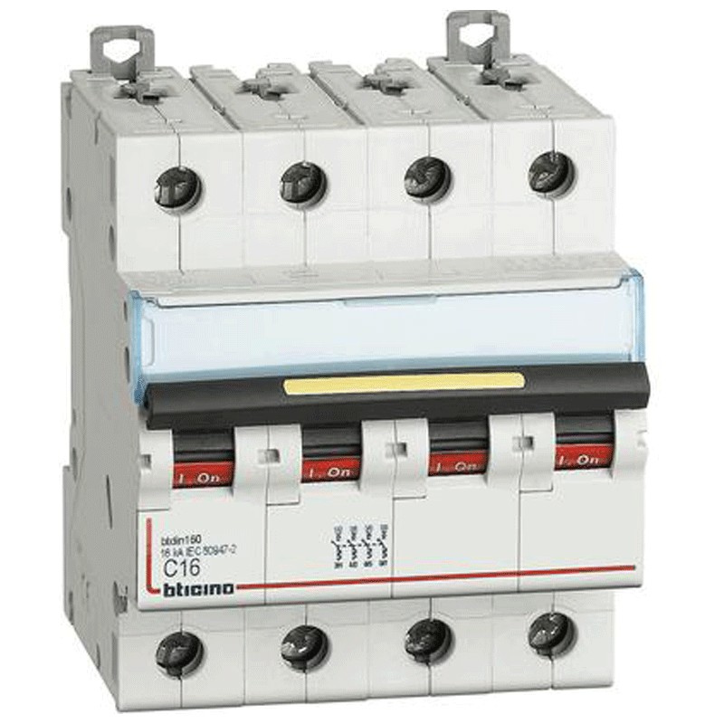 Interruttore magnetotermico Bticino, 4 moduli, attacco DIN (universale per qualsiasi centralino in commercio), poli 4P, 16 ampere, potere di interruzione 16kA, tensione 400 Vac, curva C.