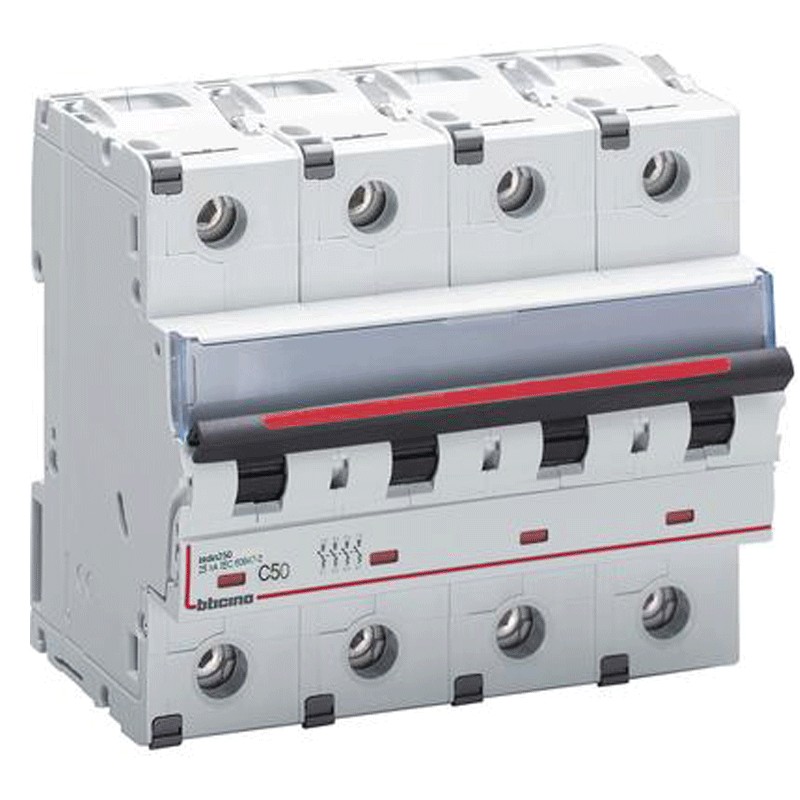 Interruttore magnetotermico Bticino, 4 moduli, attacco DIN (universale per qualsiasi centralino in commercio), poli 4P, 50 ampere, potere di interruzione 25kA, tensione 400 Vac, curva C.