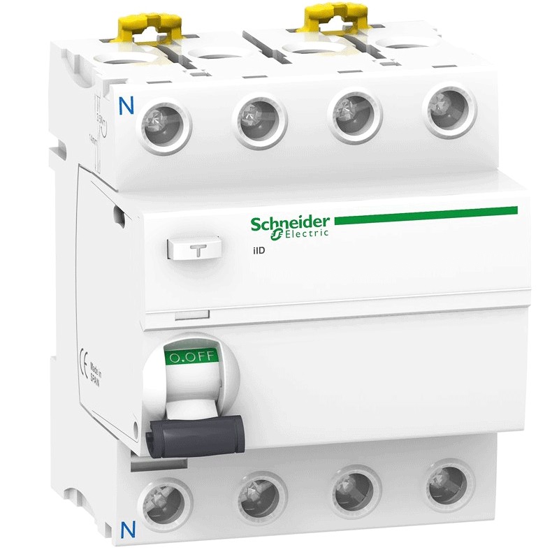 Interruttore differenziale puro Schneider, 4 moduli, attacco DIN (universale per qualsiasi centralino in commercio), poli 4P, 40 ampere, corrente differenziale Idn 500mA, tensione 380/415 Vac, tipo di differenziale AC.