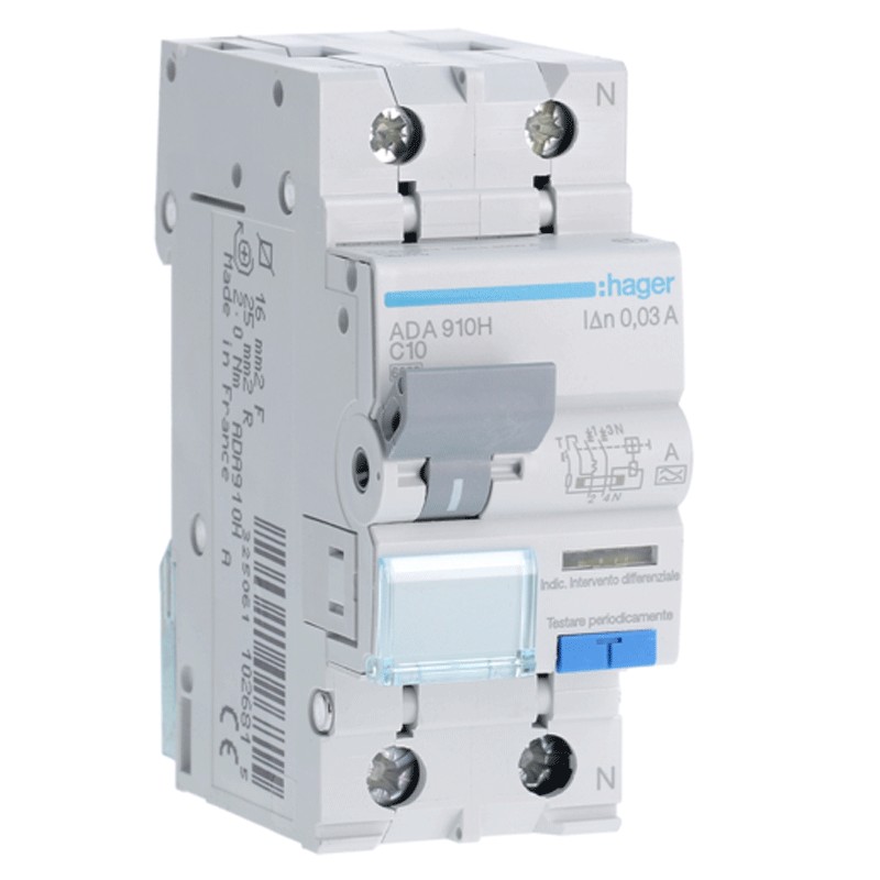 Magnetotermico Differenziale Hager 1P+N 10A 6kA 30mA curva C Tipo A 2M ADA910H