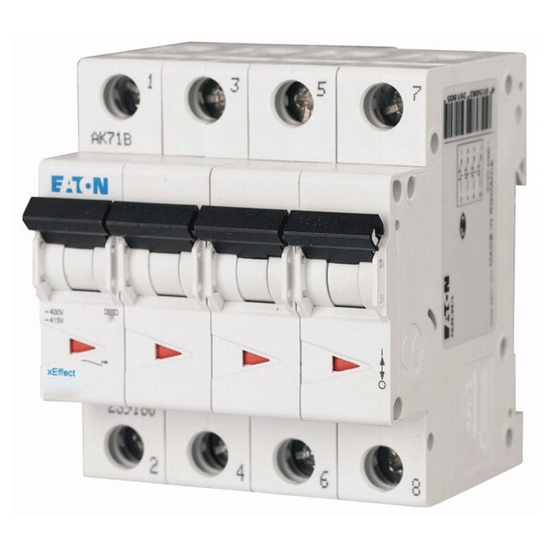 Interruttore magnetotermico Eaton, 4 moduli, attacco DIN (universale per qualsiasi centralino in commercio), poli 4P, 40 ampere, potere di interruzione 6kA, tensione 230/400 Vac, curva C.