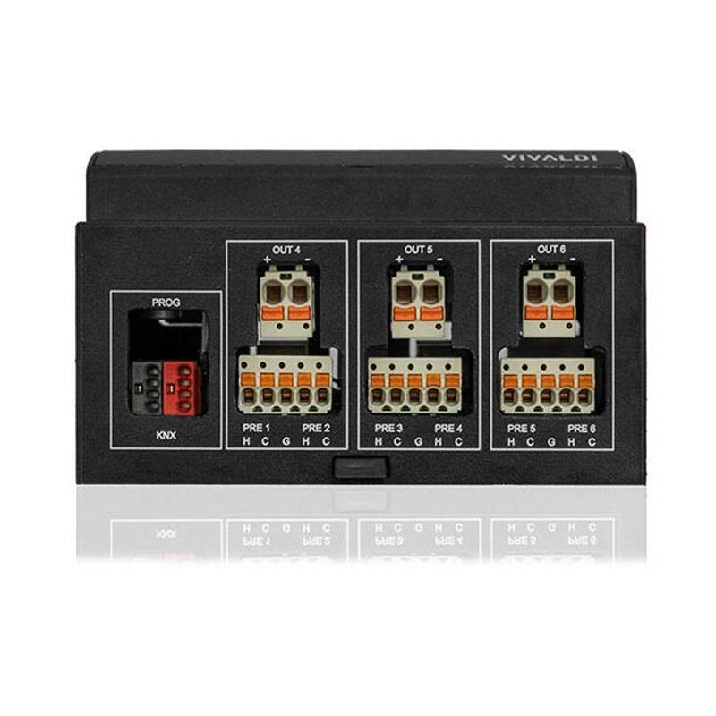 - Uscite: 6 uscite amplificate (6x20W @ 4 ohm), 6 uscite preamplificate bilanciate.