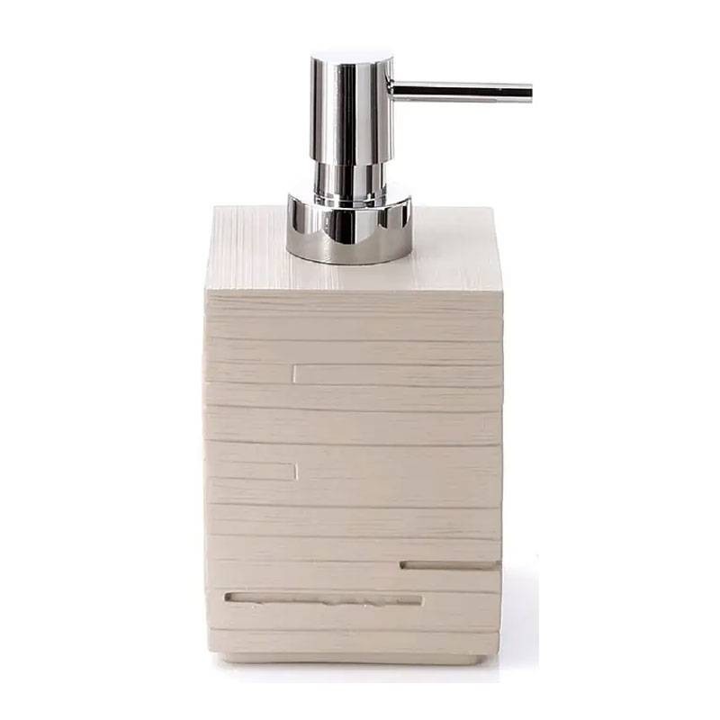 Dosasapone dispenser liquido d'appoggio Gedy Quadrotto colore tortora chiaro, realizzato in resina, con erogatore in plastica cromata, dimensioni 8,2x8,2x16cm.