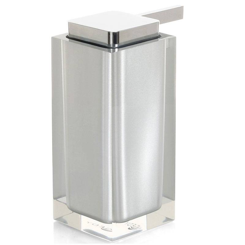 Dosasapone dispenser liquido d'appoggio Gedy Rainbow colore argento, realizzato in resina, dimensioni 7x11,3x17,2cm, con erogatore in plastica cromata.