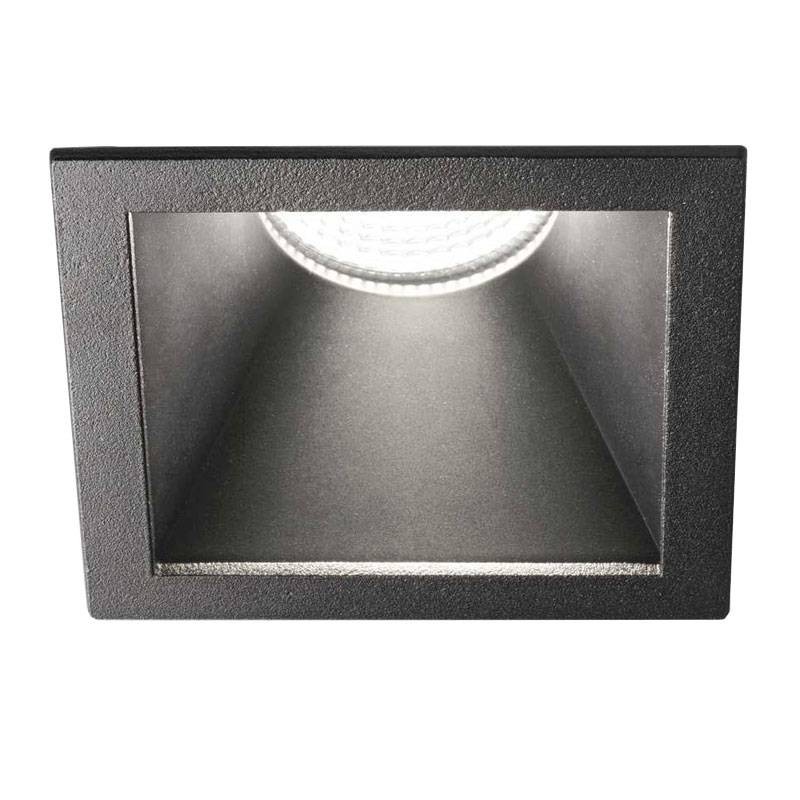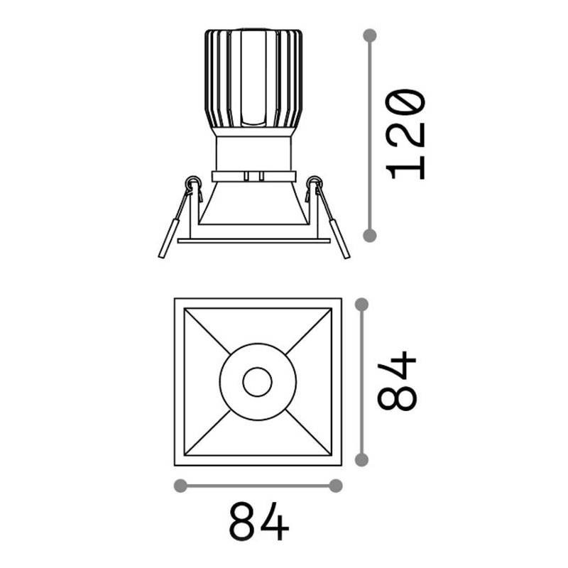 Faretto ad incasso in alluminio pressofuso con ghiera quadrata, adatto per installazione su soffitti in cartongesso o a pannelli. Finitura bianca opaca.
