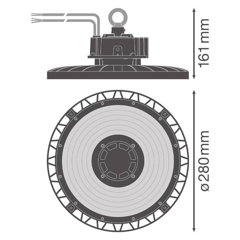 Costruito con corpo in alluminio resistente e copertura in policarbonato, è classificato IP66 per la protezione contro polvere e getti d'acqua, e IK10 per la massima resistenza agli urti. La durata utile fino a 100.000 ore (L80/B10 a 25 °C) e la possibilità di dimmerazione 0-10V lo rendono ideale anche per installazioni professionali ad alta efficienza.