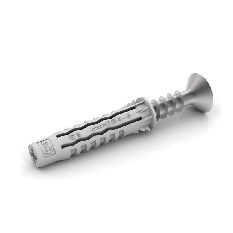 Tassello in nylon (PA) 6.6 di prima qualità con espansione a 4 vie con alette antirotazione per fissaggi leggeri in astuccio per fissaggi leggeri sui più comuni materiali da costruzione: calcestruzzo, pietra naturale, mattoni pieni e perforati, blocchi cavi di calcestruzzo leggero, cemento armato, pannelli di cartongesso.