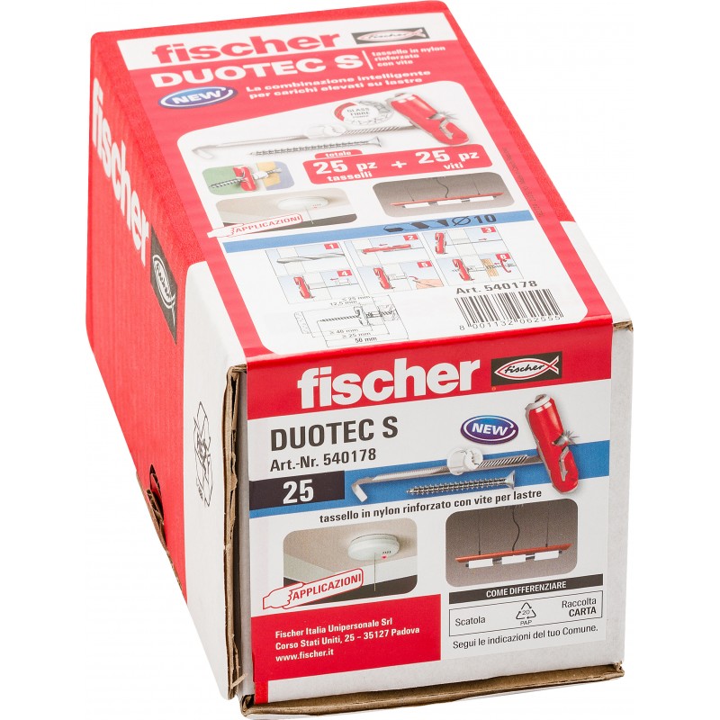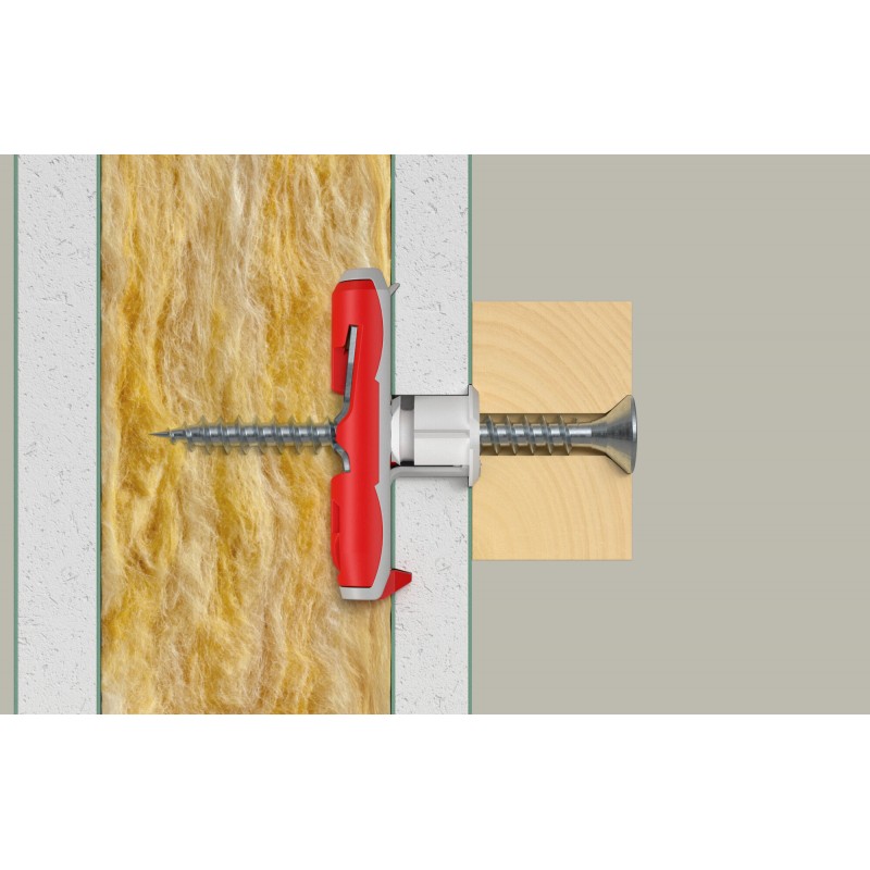 Fissaggio ad ancora Fischer DuoTec 10 S, con vite a testa svasata piana, ideale per pannelli e cartongesso. Alte prestazioni di carico, montaggio semplice e fissaggio invisibile.