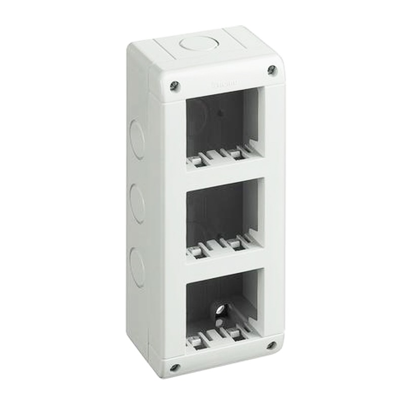 Custodia Idrobox Bticino verticale, composta da base e coperchio, 6 moduli (2+2+2) per serie Bticino Matix. Grado di protezione IP40.