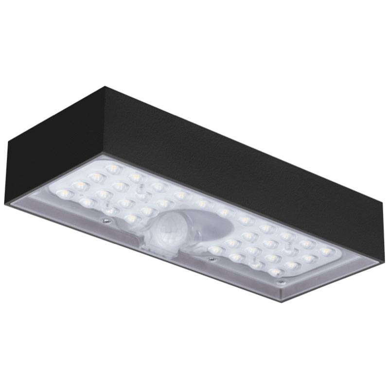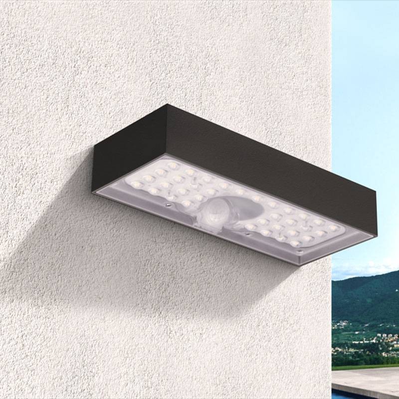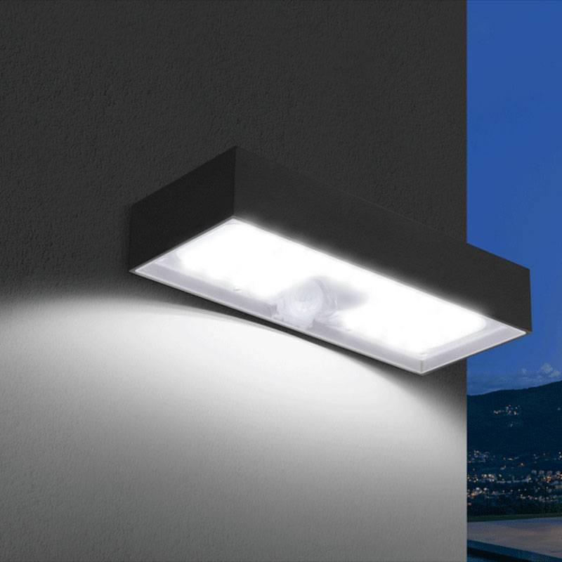 Applique solare con pannello fotovoltaico, sensore crepuscolare e sensore PIR di movimento. Forma adatta ad installazioni pratiche e discrete.