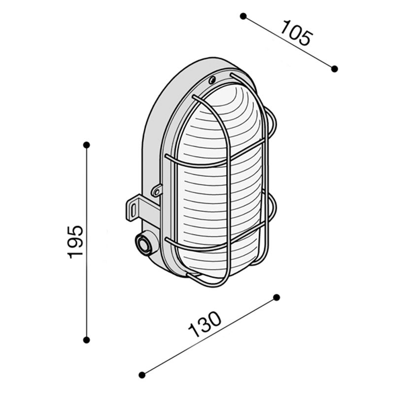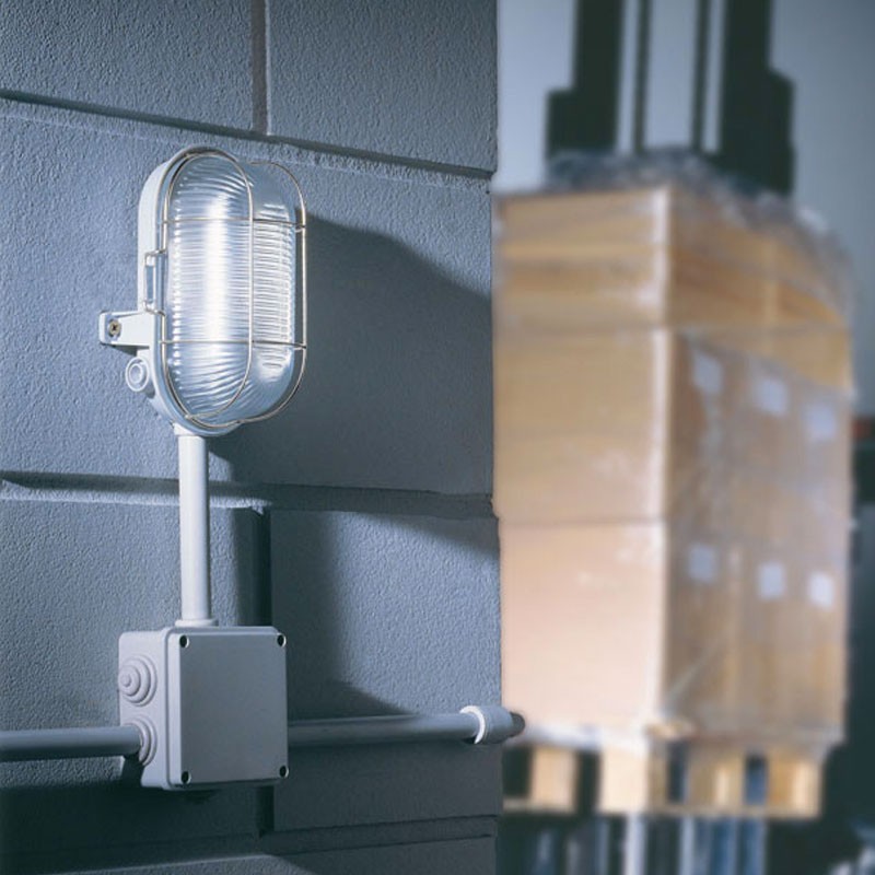 La base è realizzata in poliammide ad alta resistenza, mentre la gabbia esterna è in metallo zincato, per una protezione efficace del vetro trasparente. Il riflettore interno in alluminio tipo L2-1060 ottimizza la resa luminosa, riflettendo in modo efficiente la luce prodotta dalla lampadina.