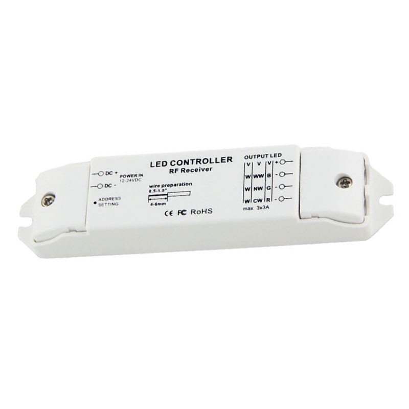 Il ricevitore dispone di 3 canali di uscita da 3A ciascuno, per una corrente totale massima di 9A. Supporta una potenza in uscita fino a 216W a 24V o 108W a 12V, rendendolo adatto alla gestione di strisce LED ad alta intensità luminosa. La configurazione 3A x 3 canali lo rende ideale per RGB, ma è perfettamente compatibile anche con bianco dinamico o dimmerazione semplice.