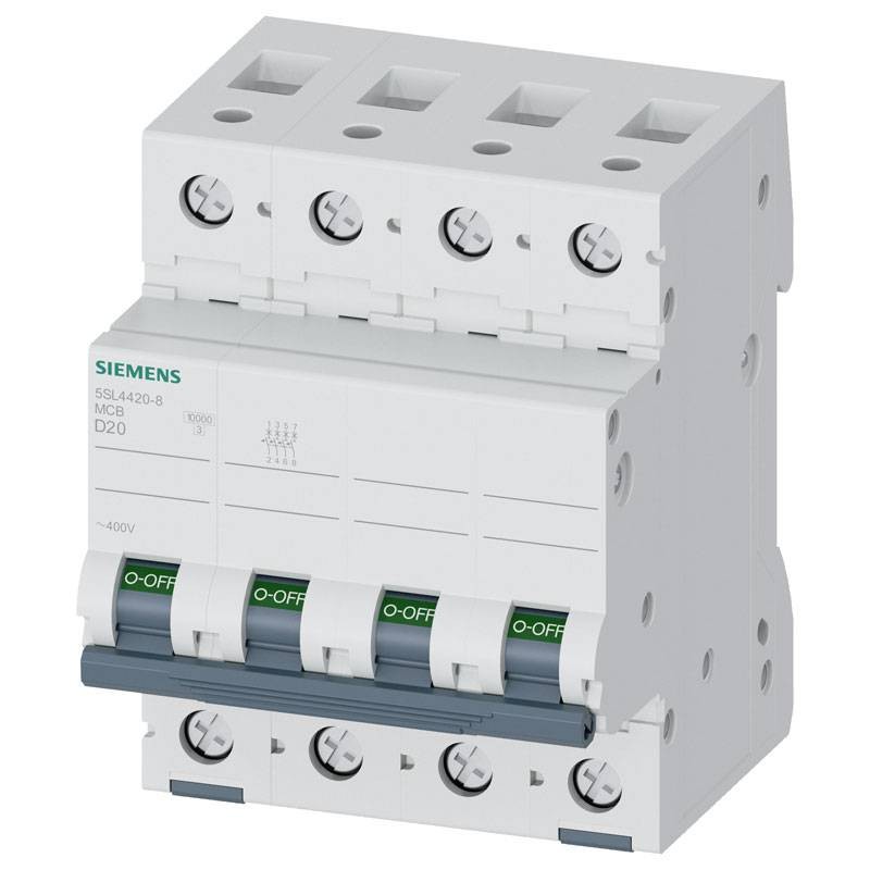 Magnetotermico Siemens 5SL44208 4 poli 20A curva D, potere di interruzione 10 kA. Ideale per circuiti con elevate correnti di spunto come motori, pompe e trasformatori.