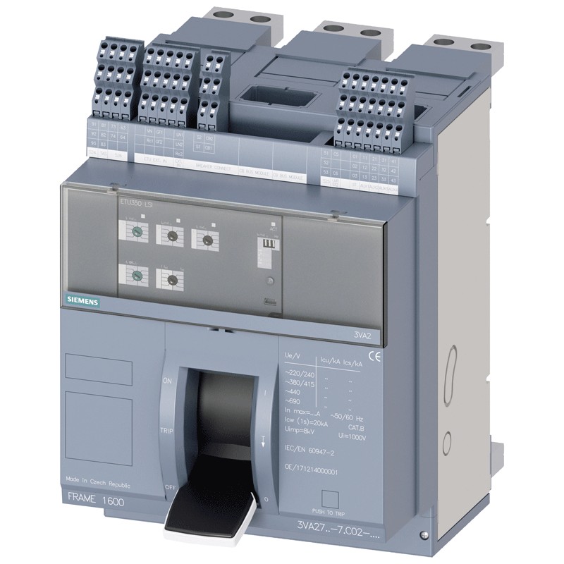 Interruttore automatico scatolato Siemens Sentron 4X1250A, potere di interruzione 55KA in esecuzione fissa con leva di comando Frame 1600; 4AUX e blocchetto di contatti di segnalazione intervento S24; Icu "M" Icu=55 kA con 415 V, a 3 poli ETU350, LSI, In=1250A.