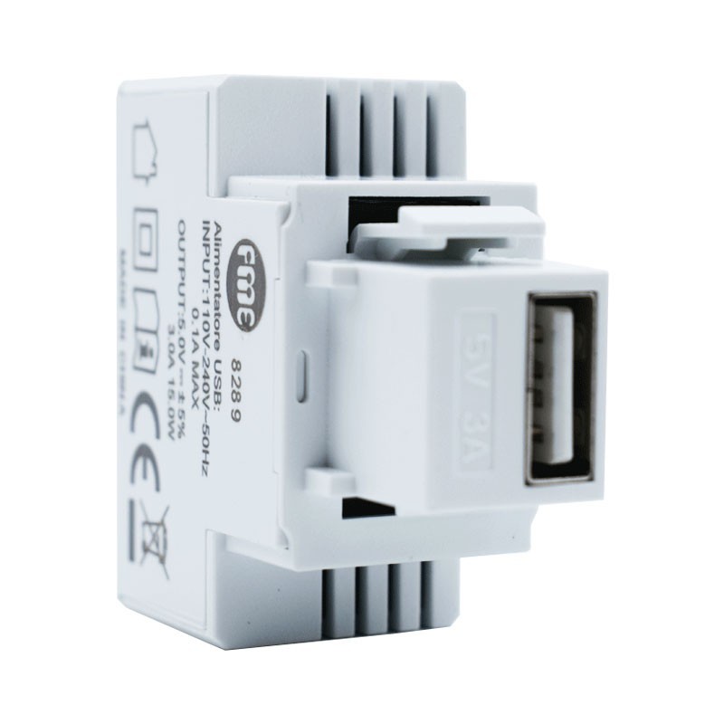 Alimentatore Keystone USB Fanton da incasso 3A, installabile neller serie civili mediante adattatori disponibili (acquistabili a parte, non inclusi). Colore bianco.