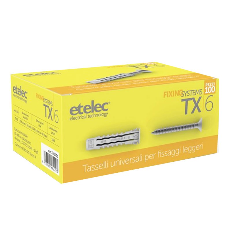 Tassello in nylon Etelec TX6 (PA) 6.6 di prima qualità con espansione a 4 vie con alette anti rotazione per fissaggi leggeri in astuccio, per fissaggi leggeri sui più comuni materiali da costruzione: calcestruzzo, pietra naturale, mattoni pieni e perforati, blocchi cavi di calcestruzzo leggero, cemento armato, pannelli di cartongesso.
