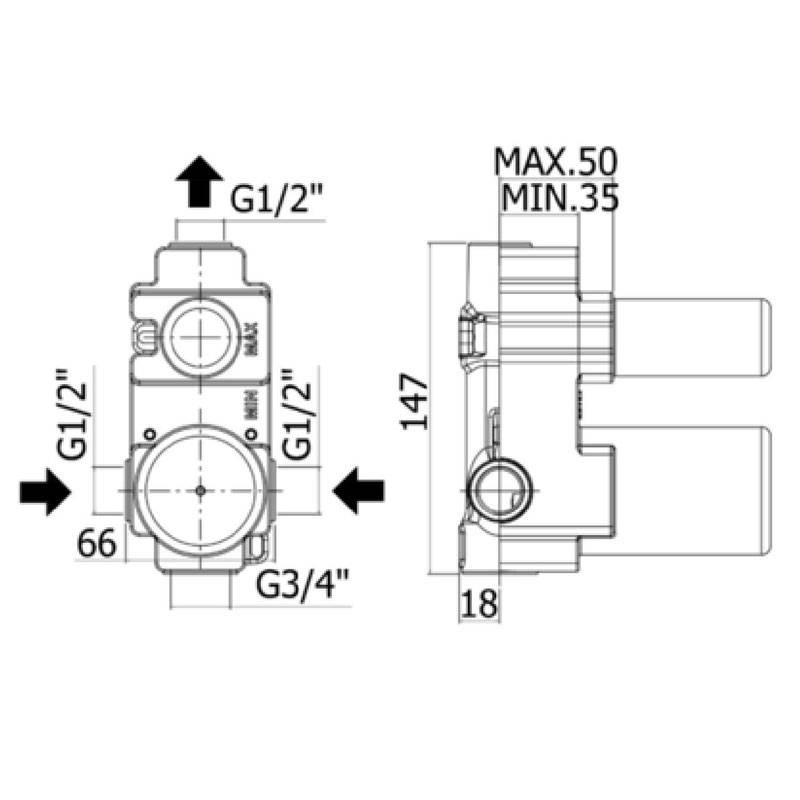 Gli attacchi standard da 1/2 pollice per calda/fredda e uscita superiore, insieme all'attacco inferiore da 3/4 pollici, rendono il miscelatore compatibile con la maggior parte degli impianti doccia. Questo garantisce un'installazione semplice e rapida, adatta sia per nuovi impianti che per ristrutturazioni.