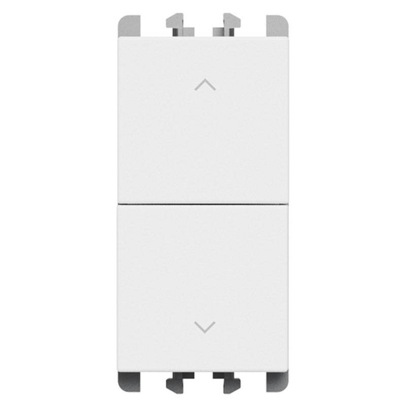 Doppio pulsante Urmet Lybra 27139.B per tapparelle, interbloccato e a 2 pulsanti NO sovrapposti, 1 modulo, 10A 250V~, colore bianco opaco. Sicuro, elegante e compatto, ideale per il controllo motore tende o tapparelle.