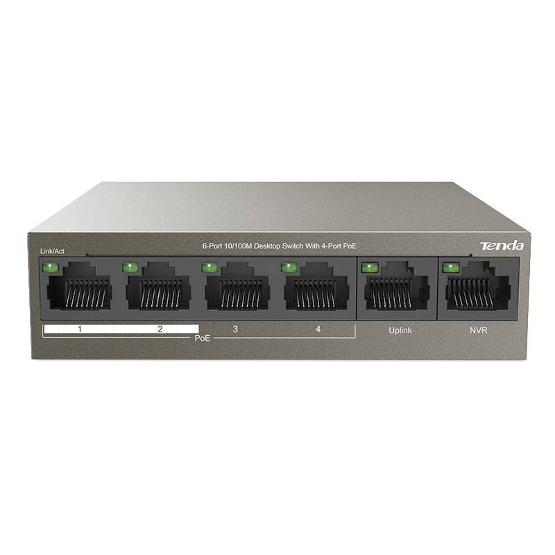 Switch Desktop PoE Tenda, progettato per reti di piccole e medie dimensioni con esigenze di videosorveglianza. Con 4 porte PoE Fast Ethernet, 2 porte uplink e una potenza PoE totale di 63W, offre connettività, alimentazione affidabile e funzionalità avanzate come QoS e trasmissione estesa fino a 250 metri, con le seguenti caratteristiche: