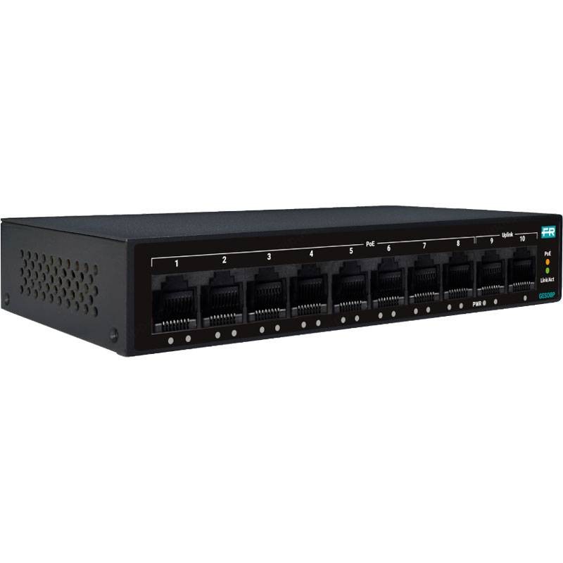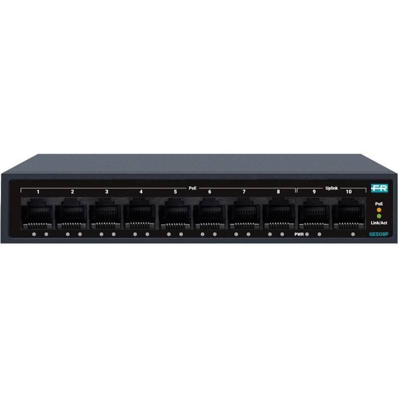 Fracarro GES08P (287868) è uno switch unmanaged Gigabit con 8 porte PoE+ e 2 uplink: alimenta e collega dispositivi IP con un solo cavo, offre PoE budget 60W, watchdog per operatività H24 e scocca metallica dissipante.