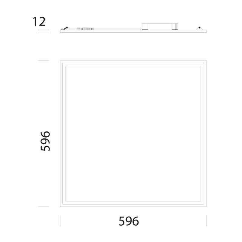 Pannello slim 596×596×12 mm, finitura bianca e verniciatura UV anti ingiallimento.
