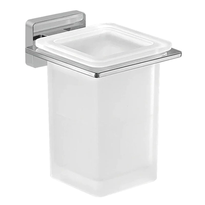 Portaspazzolini in vetro con supporto in acciaio inox finitura cromo lucido. L'installazione è eseguibile con colla, venduta separatamente, se il peso da sorreggere è inferiore o uguale a 7 kg, altrimenti con viti in dotazione.