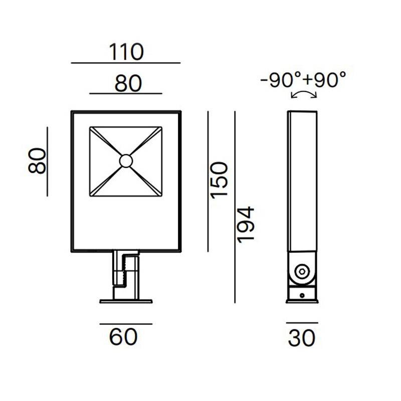 Materiali: Alluminio pressofuso, vetro serigrafato nero, riflettore in alluminio stampato
